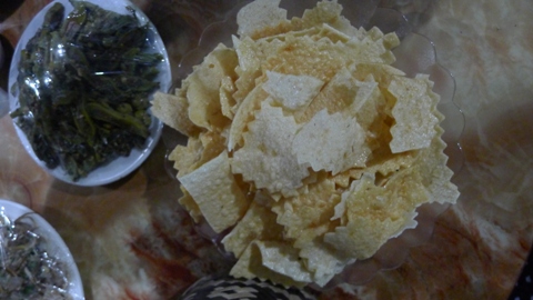 「タイ族の料理は豊富ですが、元々は貧しさが生み出したものです。今日、畑から帰る途中、何種類の葉を摘んできました。これらの葉は食べられるんですよ。また、魚を水揚げすることもできないので、苔を取ってそうざいを作ります。」