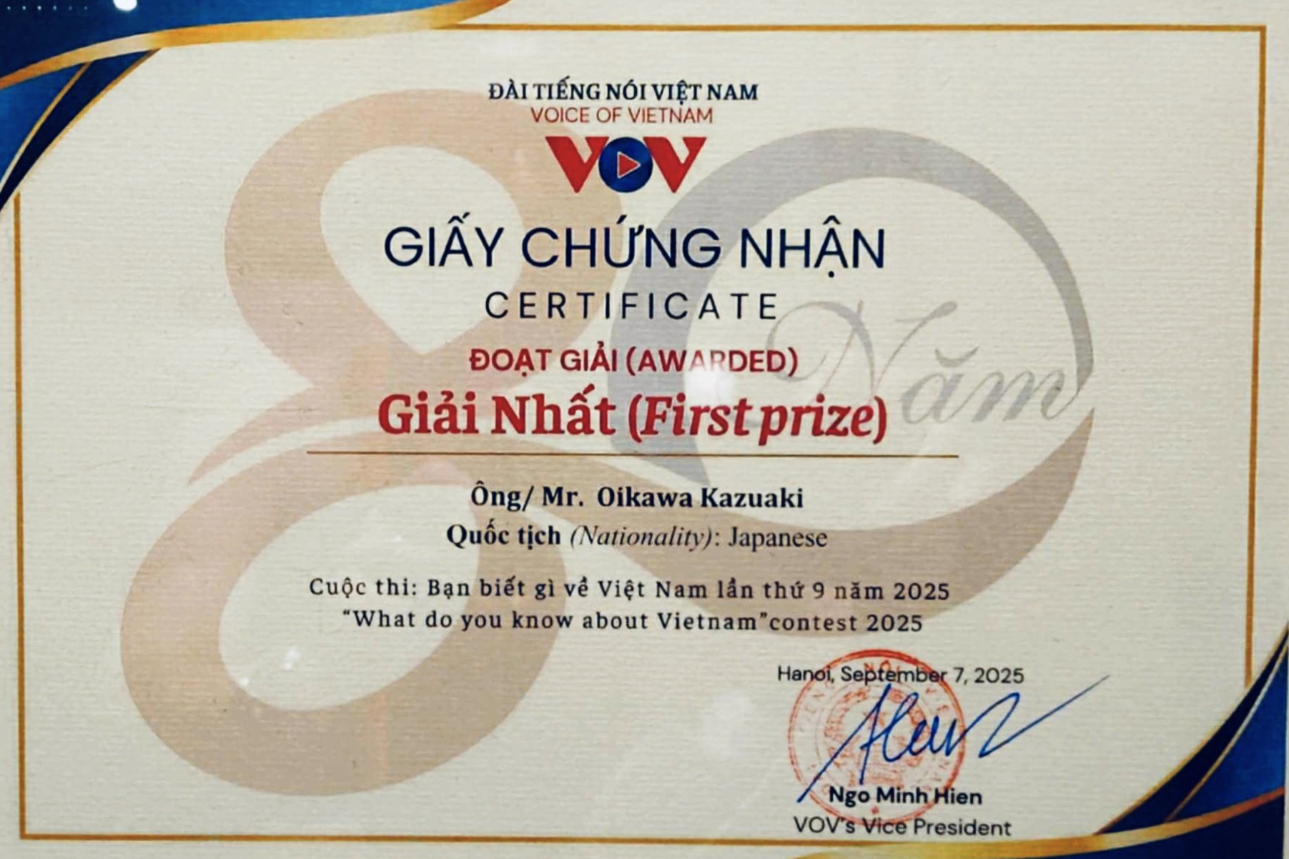 既にお知らせしましたとおり、VOV=ベトナムの声放送局が今年3月10日から6月30日にかけて開催した「ベトナムについてどれだけ知っていますか2025」コンテストで、日本語放送のリスナー及川三晶さんが最高賞を受賞されました。心よりお祝い申し上げます。