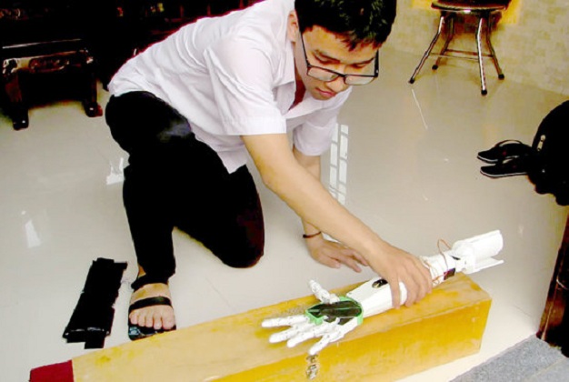 今年は、ベトナム中部にあるクアンチ省の高校2年生、ファム・フイさんが見事、第3位に輝きました。フイさんのテーマは、体の不自由な人向けの上肢ロボット、手や腕に付ける装置の開発です。クアンチ省は、戦争中から地中に埋められている地雷や不発弾の被害が激しいところです。加えて、この地方には地形が険しいところが多く、交通事故も多発しています。こういったことから、フイさんは幼い頃から、地雷や事故などで体が不自由になった人を助けたいと思うようになりました。