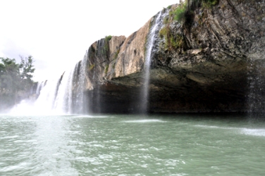 「この滝は三段式になっています。一番上の段の水位は浅いので、誰もが入れます。真ん中の段には鋭い石があるので、ここを見学する時、救助係の案内を順守しなければなりません。3段目、つまり一番下の水深は8メートル~10メートルですが、岩石に沿ってゆくと、洞窟にたどりつくことができます。その洞窟からドレイ・ヌル滝が一望できます。」