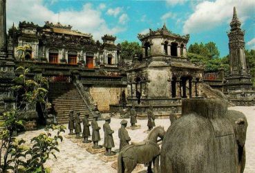 古都フェ遺跡群の中には1085年にグェン(阮)王朝時代のミンマン王が建設した王宮が代表的な見所です。200年もの歳月を経た今もなお、この王宮には140の施設が昔のまま保存されています。フエ市内を流れるフォン川(香川)の北岸に位置する王宮の総面積は500ヘクタールで、周囲は10キロメートル、高さ5mの城壁に囲まれ、その外側に内堀がめぐらされています。王宮は皇城(ホアンタイン)あるいは大内(ダイノイ)とも呼ばれました。門は四面に一つずつあり、南を午門(ゴモンNgo Mon)といい、王様だけがこのゴモンを利用できます