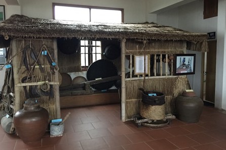 郷土博物館の目玉は中央にある4階建ての建物です。そこは農村に関する代表的な品々が展示されるところです。この建物は現在、ベトナムの農村部によくみかける家屋です。この建物の一階はこの博物館の所有者にかかわる品々と戦争に関する品々が展示され、三階は陶磁器、籐や竹細工が展示されていますが、最も注目すべきところは2階です。先ほどの郷土博物館のガイド人 チャン・テイ・フエ( Tran Thi Hue) さんはさらに次のように語りました。
