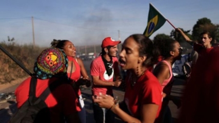 ルセフ大統領の糾弾に反抗するデモ参加者=ロイター