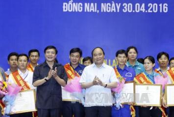 優れた労働者に表彰状を引き渡すフック首相(正面右)=Thống Nhất-TTXVN