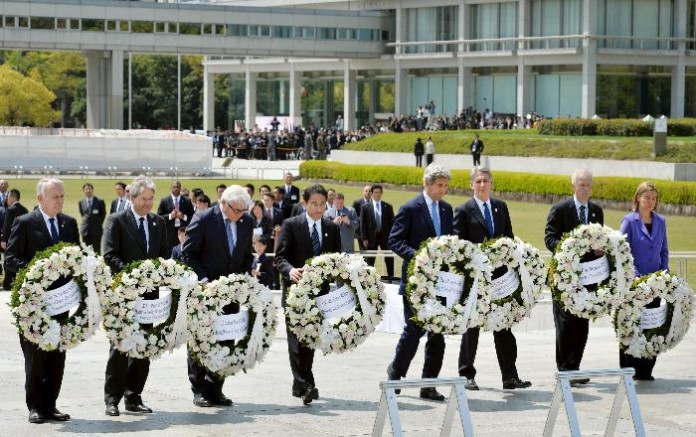 G7外相らが平和記念公園で原爆死没者慰霊碑に献花