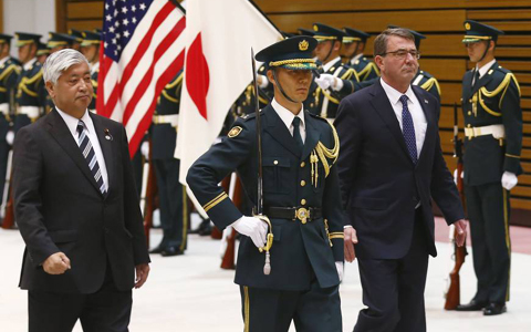 日本を訪問中のカーター国防長官の歓迎式典(写真:The Japan Times)