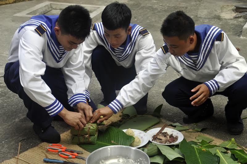 海軍兵士がテトの伝統的料理バインチュンを作る