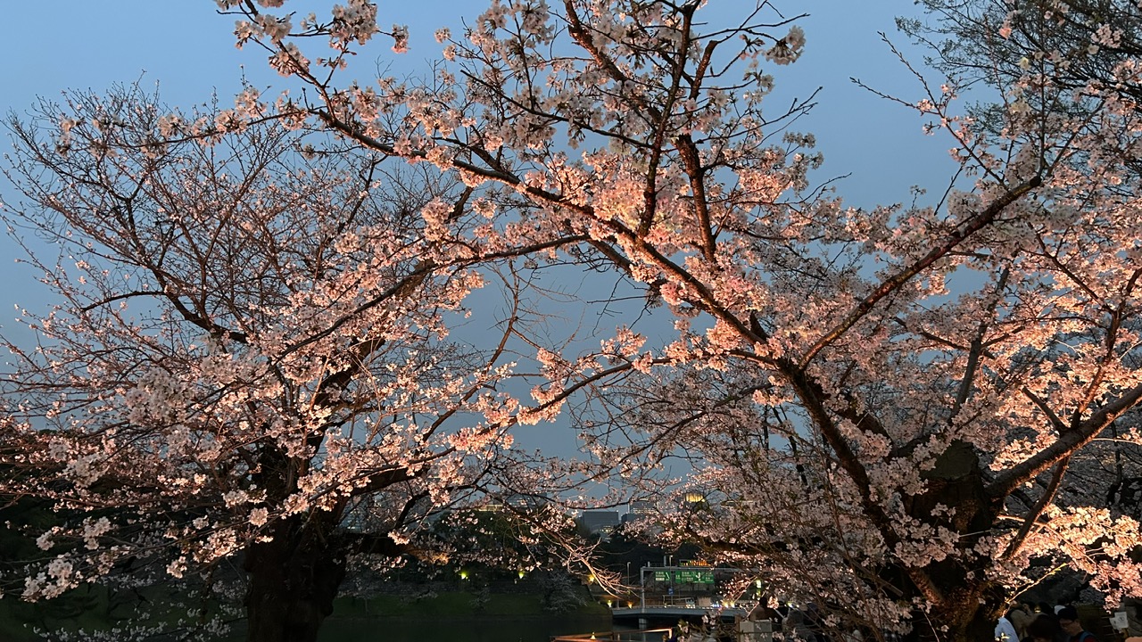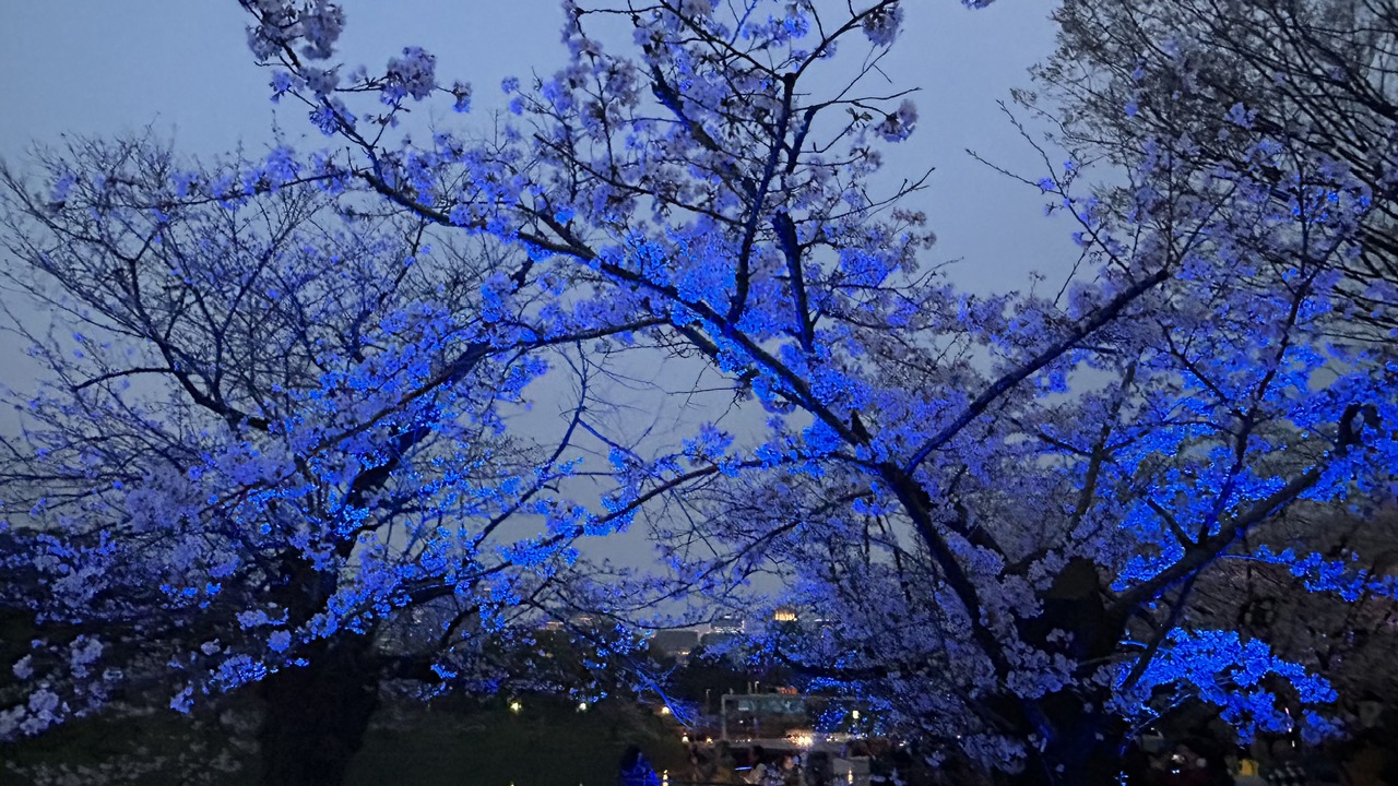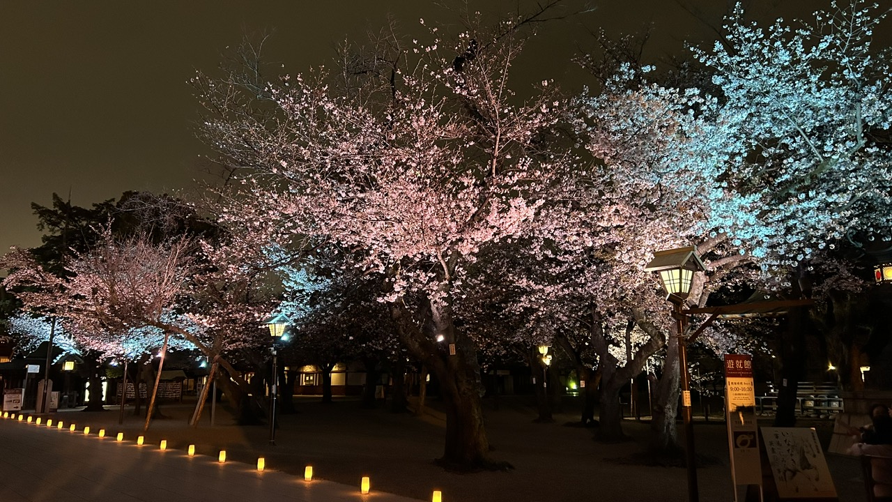 | ライトアップで幻想的な雰囲気に包まれる桜の風景 |