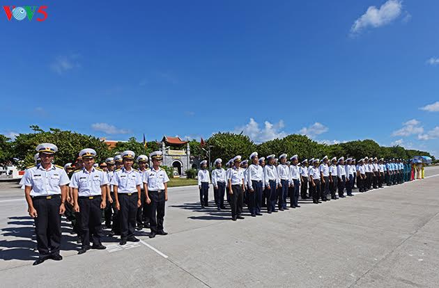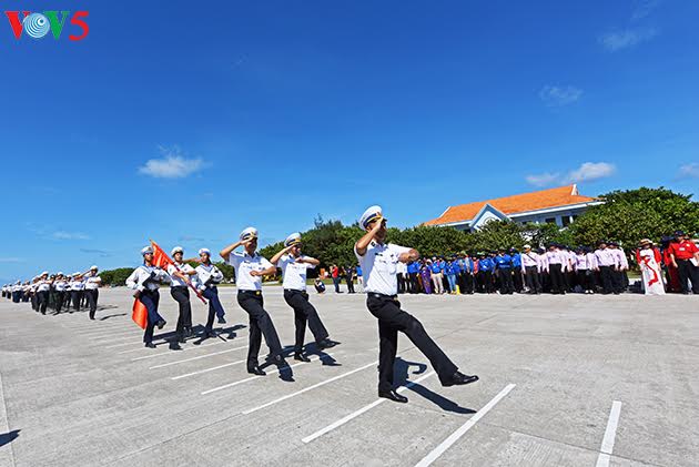 | チュオンサ群島の強い風と日差の中で、参加者は、国の領海を断固として守ると誓い、あらゆる困難を乗り越え任務を全うする決意を表わす後、国歌を歌った。 |