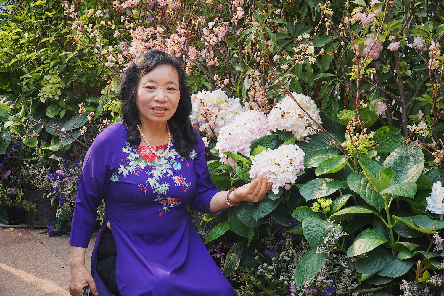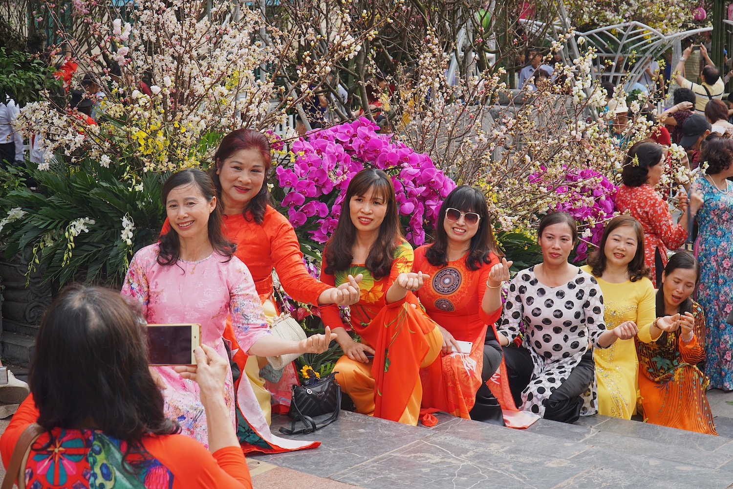 | 桜を背景にしてアオザイの写真を撮る |