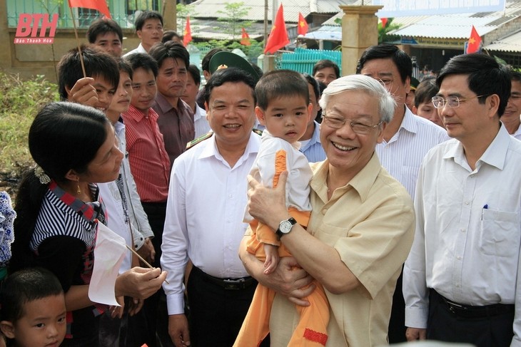 | グエン・フー・チョン書記長と北中部タインホア省の最も困難な山岳地帯であるムオンラット県の住民(写真:Báo Thanh Hóa) |