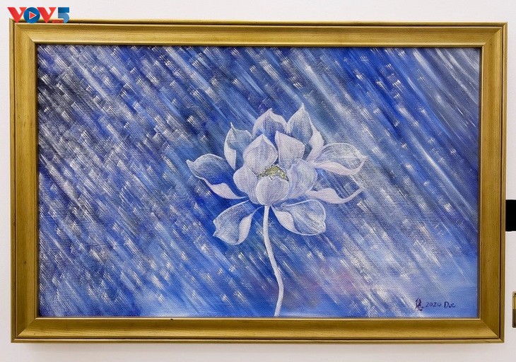| 展示会で、画家キム・ドゥック氏による蓮の花にちなんだ絵画75点が展示され、その価値は2000万ドルにのぼる |