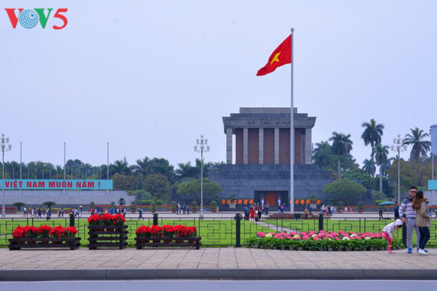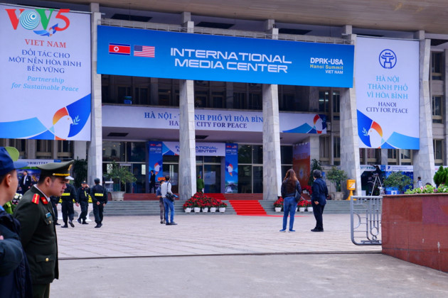 | 米朝両国の国旗が掲げられているテイホ区 |