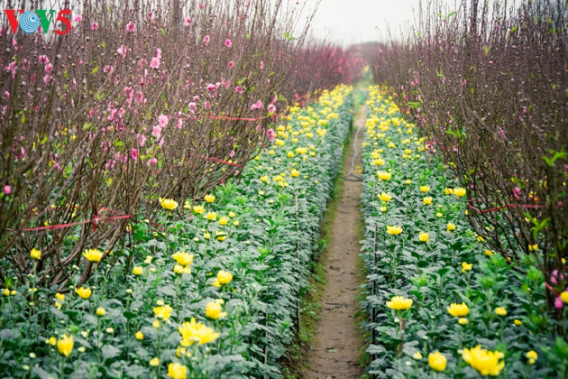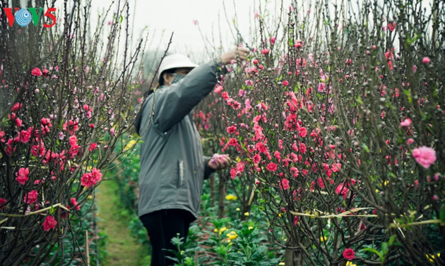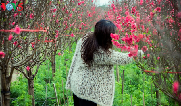 | 寒い風の中に咲き誇るニャッタン村の桃の花 |