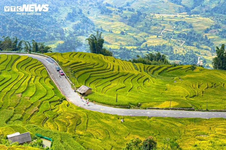 | ガイタウ坂道やチョアンテン集落から見下ろすと、棚田が山の斜面に沿って幾重にも続き、黄金の波のように柔らかくうねる |