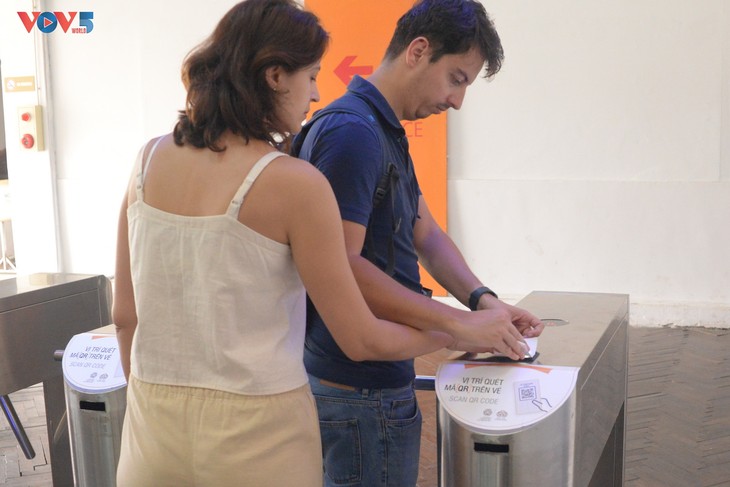 | タンロン王城遺跡でQRコードをスキャンし、チケットを購入する訪問者 |