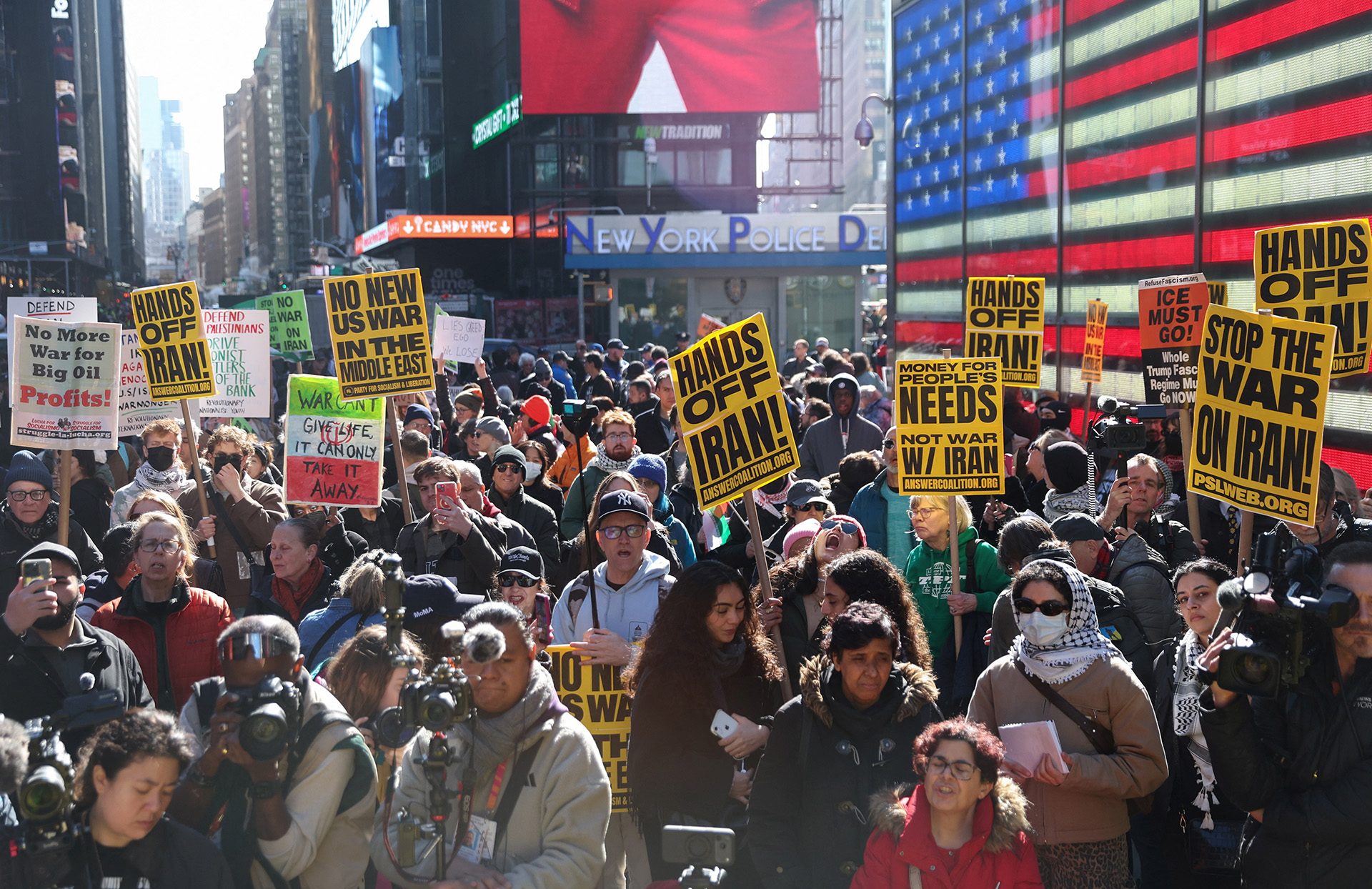 2026年2月28日、アメリカとイスラエルによるイラン攻撃に抗議し、ニューヨークのタイムズスクエアに集まった数千人のデモ参加者(写真:REUTERS/Heather Khalifa) |