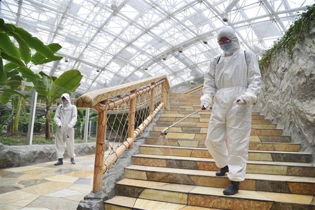 朝鮮民主主義人民共和国の首都平壌で、動物園内を消毒する作業員=Kyodo/TTXVN |