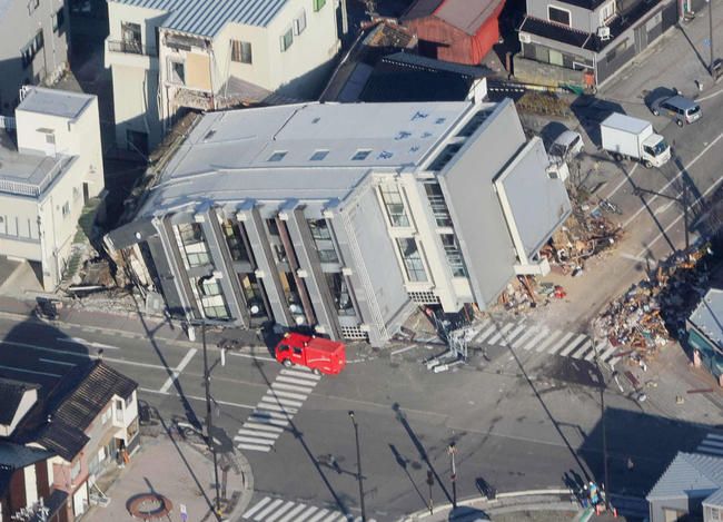 2024年1月1日、能登半島地震で倒壊した7階建てのビル(写真:時事通信) |