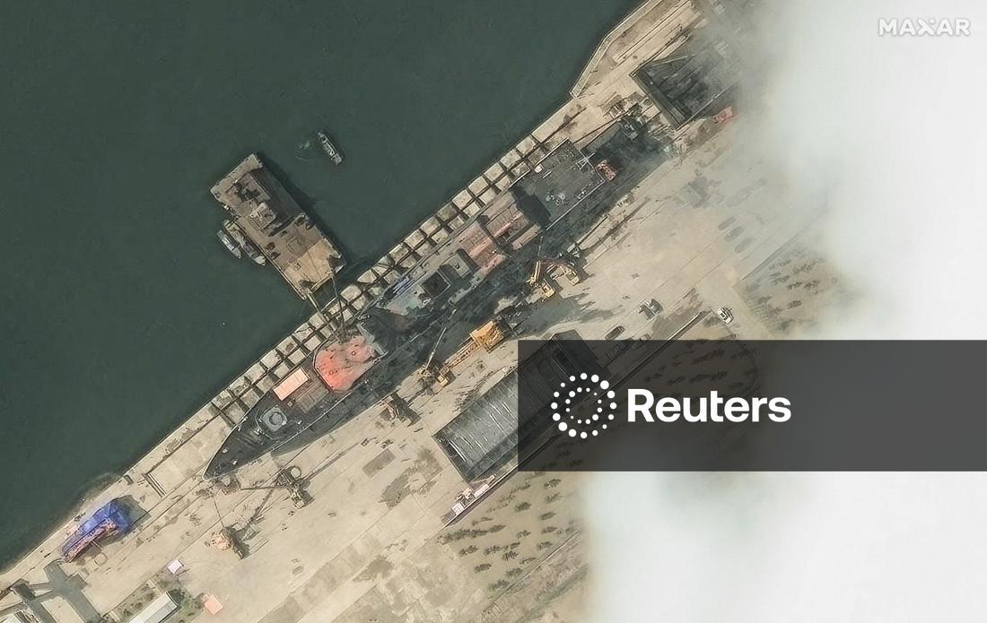 2025年5月18日、朝鮮の清津港で、進水前の北朝鮮新型軍艦を捉えた衛星画像(写真:Maxar Technologies/Handout via Reuters) |