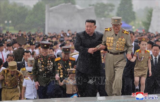2024年7月26日、朝鮮・平壌の「祖国解放戦争参戦烈士の墓」を訪れた金正恩朝鮮労働党総書記(中央)(Yonhap/TTXVN) |