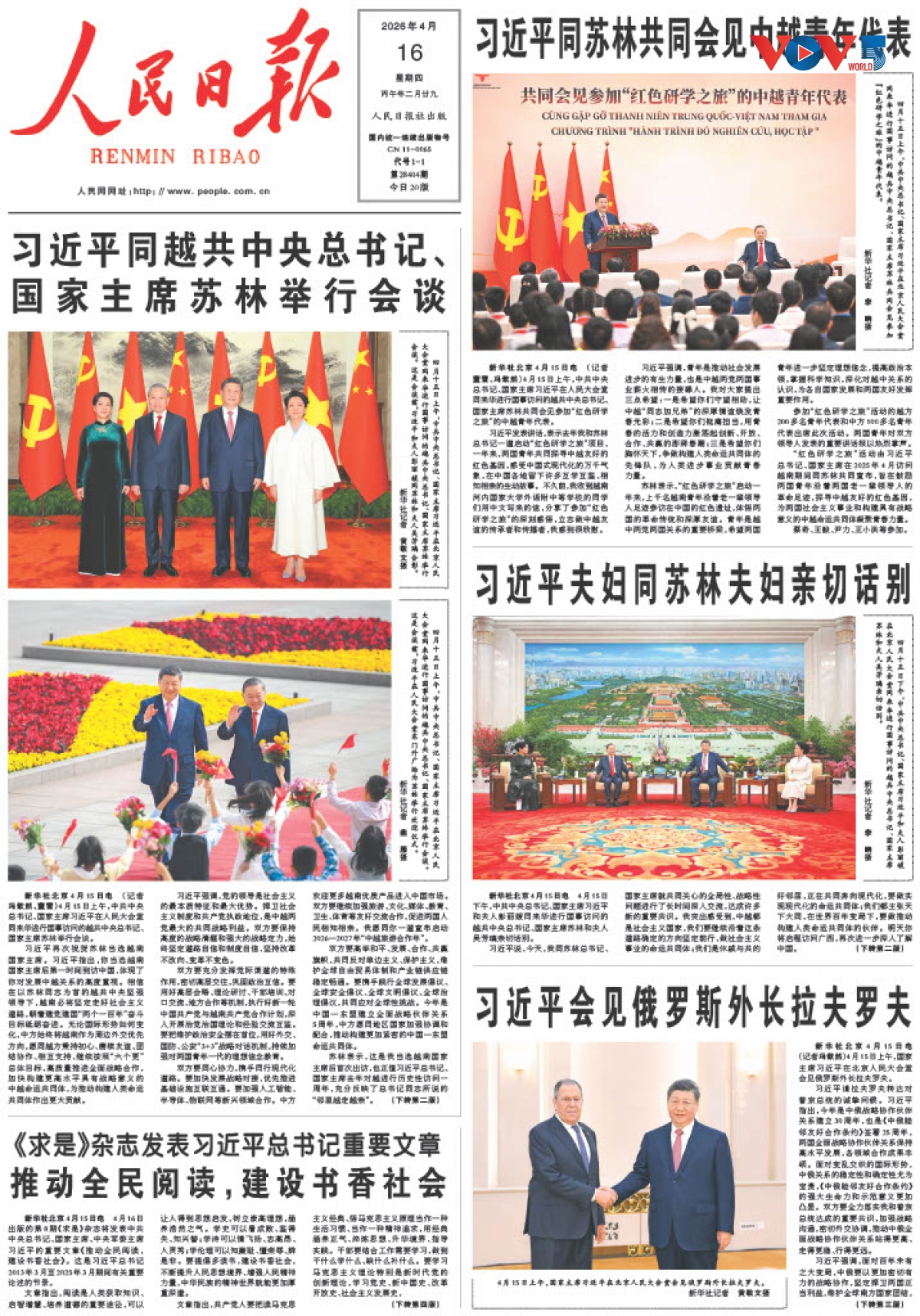 16日付の中国共産党機関紙「人民日報」は、1面の大半および2面、3面を割きトー・ラム書記長・国家主席と習近平総書記・国家主席との会談、ならびに中国の党・国家指導者らとの会見の様子を大きく報じました。あわせて、ベトナム高官代表団に同行している政治局員らの活動についても詳細に伝えています。