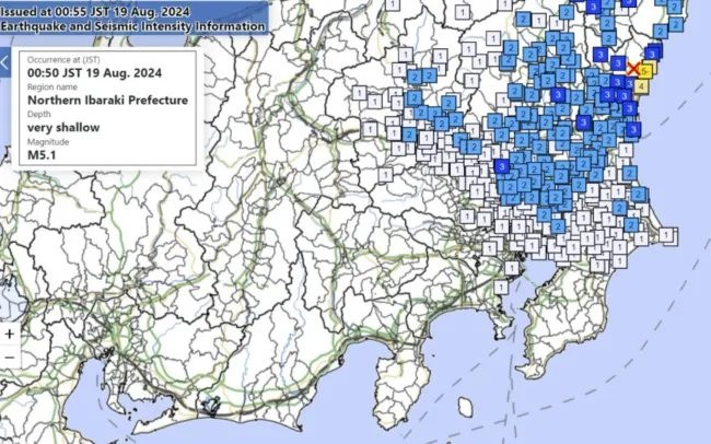 19日午前0時50分ごろ、茨城県北部で震度5弱の地震が発生しました。気象庁によりますと、震源地は茨城県北部で、震源の深さはごく浅く、地震の規模はマグニチュード(M)5.1と推定されています。津波の心配はないとされています。