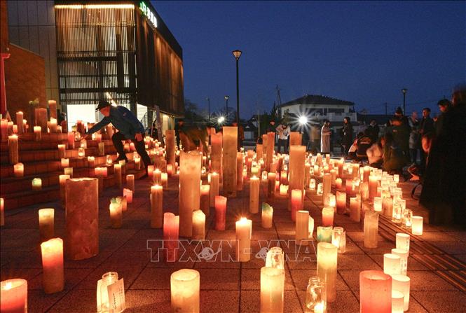 2025年3月10日、日本の福島県双葉町で、2011年の東日本大震災・津波の犠牲者を追悼し、ろうそくを灯す人々(写真:Kyodo/TTXVN) |