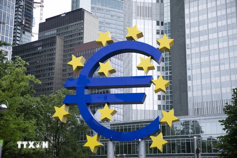 ドイツ・フランクフルトで、欧州中央銀行(ECB)のあるユーロタワービル前の「ユーロ」通貨マークのオブジェ(THX/TTXVN) |