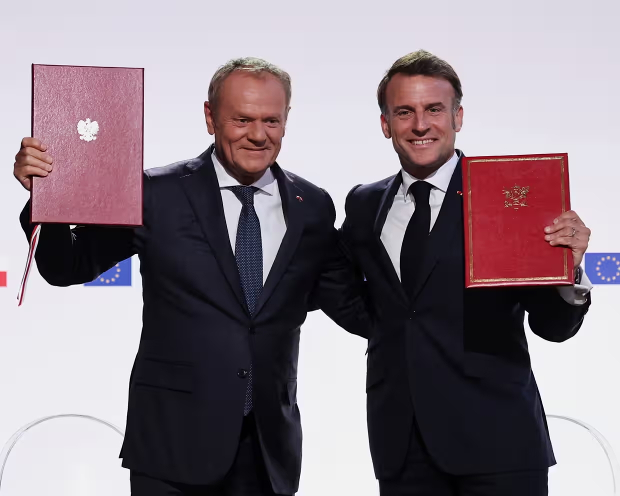 2025年5月9日、フランス東部ナンシーで、条約署名後に写真撮影に応じるフランスのマクロン大統領(右)とポーランドのトゥスク首相(写真:AP) |