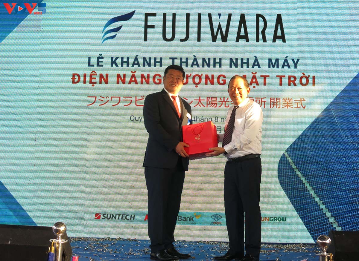 19日午後、南中部沿岸地方ビンディン省クイニョン市のニョンホイ経済特区内で、株式会社フジワラが100%出資するベトナム現地法人フジワラビンディン有限会社により建設された50MWの太陽光発電所(メガソーラーパーク)プロジェクトの第1段階を完工する式典が行われました。