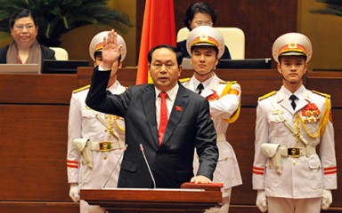 「国家の最高指導者、また国防安全保障評議会議長として祖国、国民の奉仕に全力を尽くすとともに民族の国家建設防衛事業、先輩の経験を受け継ぎ、民族大団結を強化し、独立、主権、領土保全、国益の確保に努力します。また、ドイモイ=刷新事業を促進し、国際社会でのベトナムの地域を向上させ、世界の平和、民主、社会進歩に貢献します。」