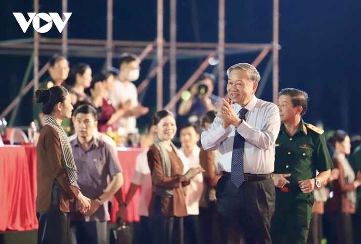 4月30日の南部解放・国家統一50周年の記念行事の一環として、20日夜、ホーチミン市で、「喜びに満ちた国」をテーマにした芸術イベントが開催され、1000人あまりのアーチストや俳優が出演しました。トー・ラム党書記長も出席しました。