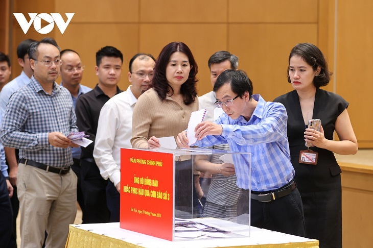 10日午後、政府本部で、ファム・ミン・チン首相と政府官房の指導者、幹部、公務員が台風と洪水の被災者への募金運動に参加しました。