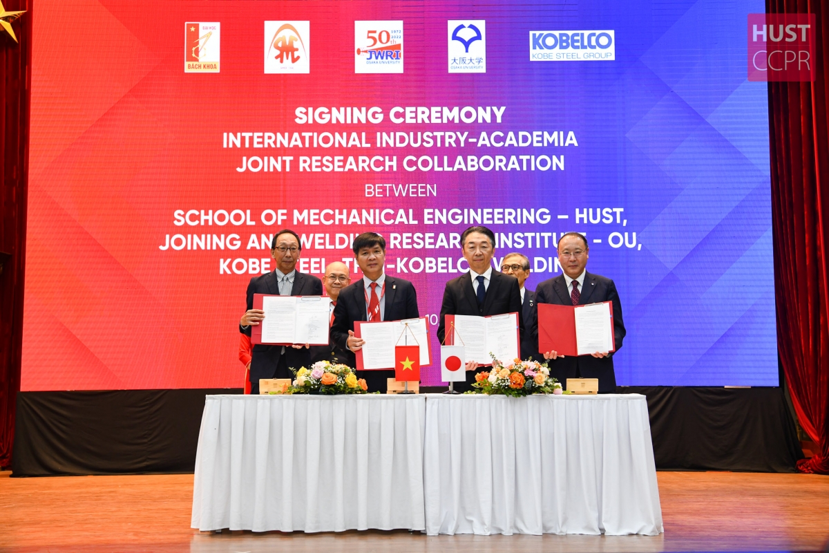 この機に、ハノイ工科大学機械工学部と大阪大学接合科学研究所、神戸製鋼所、神戸製鋼所の溶接事業部門のタイ現地生産・販売拠点であるThai Kobe Welding子会社は、溶接研究と技術移転に関する協力覚書の調印式を行いました。