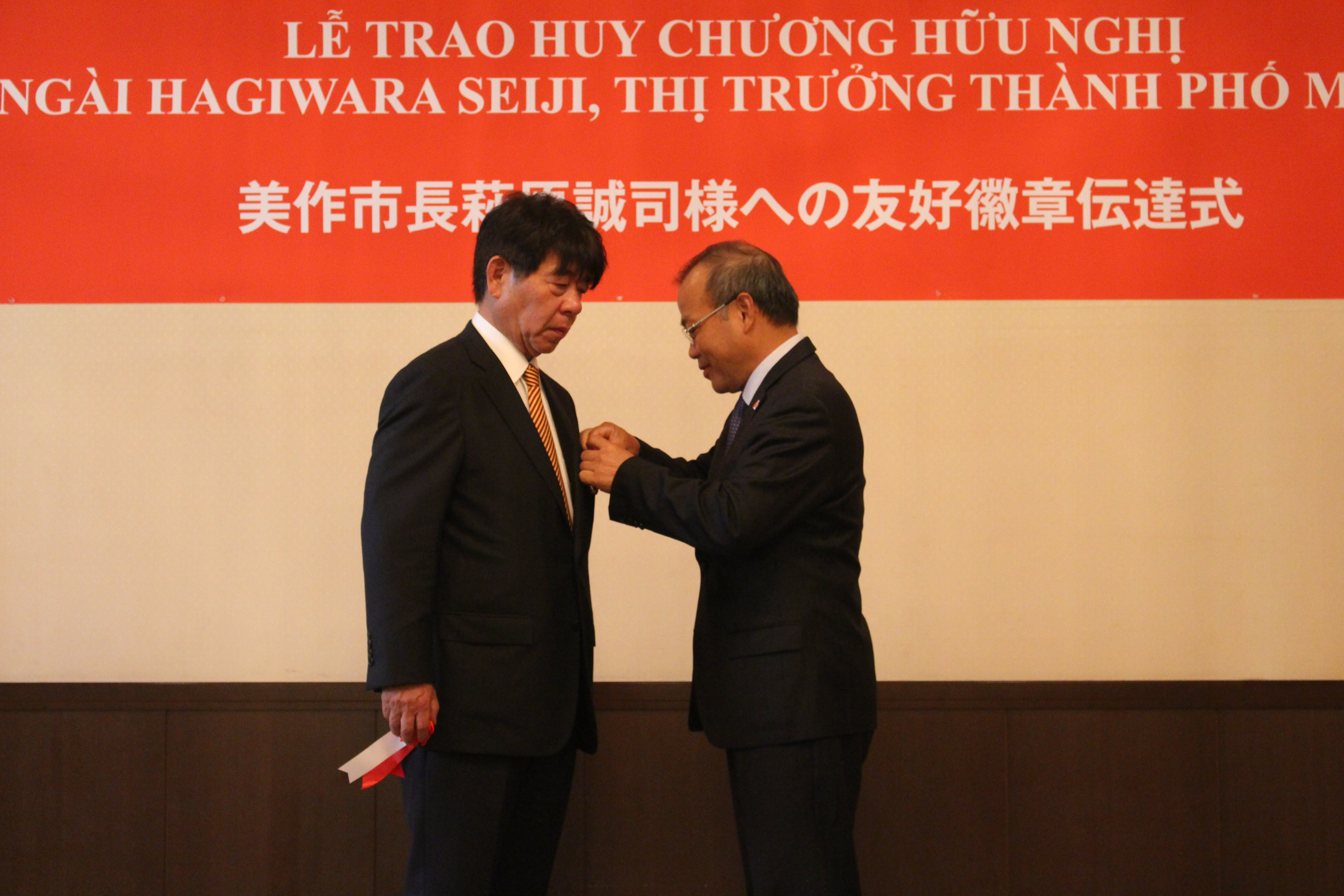 16日午前、在日本ベトナム大使館でベトナム国家主席の委任を受け、在日本ベトナム大使館のブ・ホン・ナム大使は、岡山県美作市の萩原 誠司(はぎわら せいじ)市長に対し、日本とベトナムとの協力関係への貢献のため、友好勲章を手渡しました。