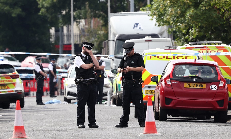 2024年7月29日、イギリス中部リバプール近郊のサウスポートで、ナイフによる襲撃事件が起きた現場を検証する警察官ら(AFP) |