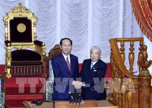 同日午後、クアン国家主席は伊達 ・忠一参議院議長と会見しました。席上、クアン主席は両国関係の強化を働きかけてきた参議院に感謝するとともに両国の立法機関に対し、情報や経験の交換、労働協力、草の根外交、地方間の協力を促進するよう要請しました。また、日本参議院に対し、ベトナム東部海域(南シナ海)に関するベトナムの立場を支持し、海上での法律施行能力の向上を支援するよう提案しました。