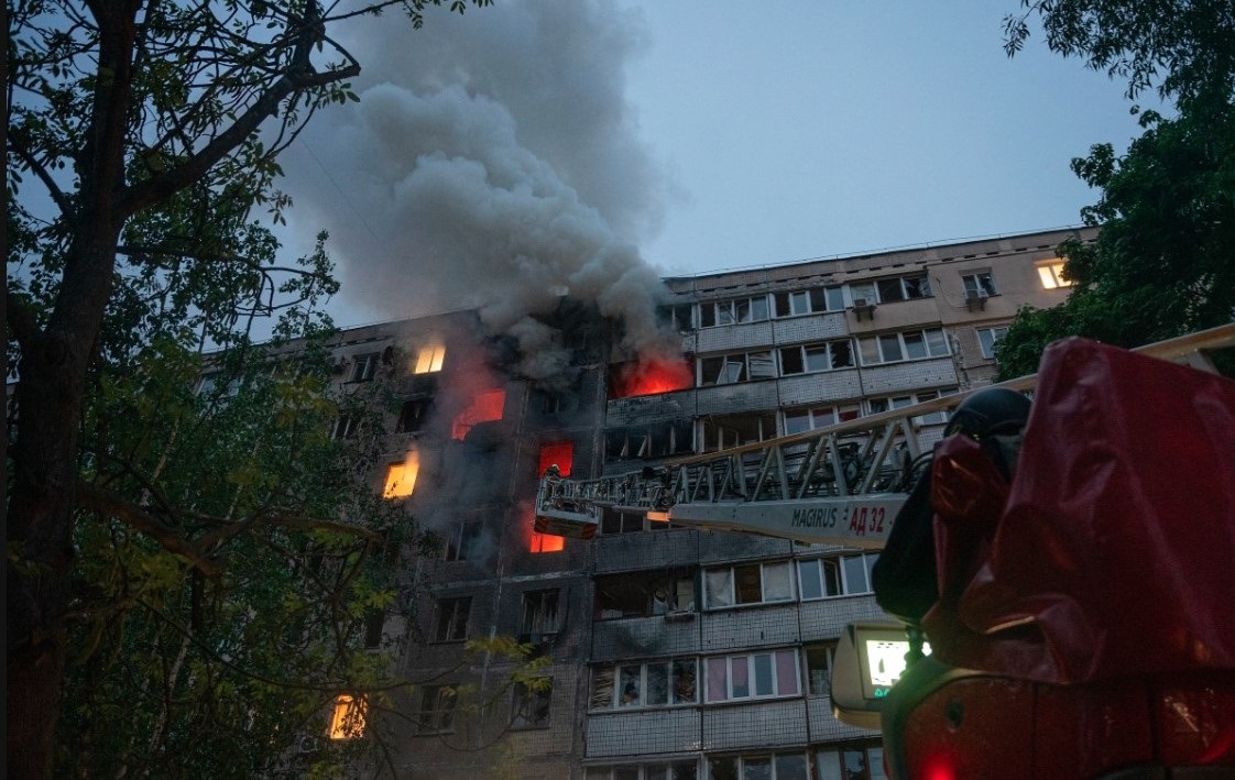 5月7日のドローン攻撃後、キエフのアパートで火災が発生(AFP撮影) |