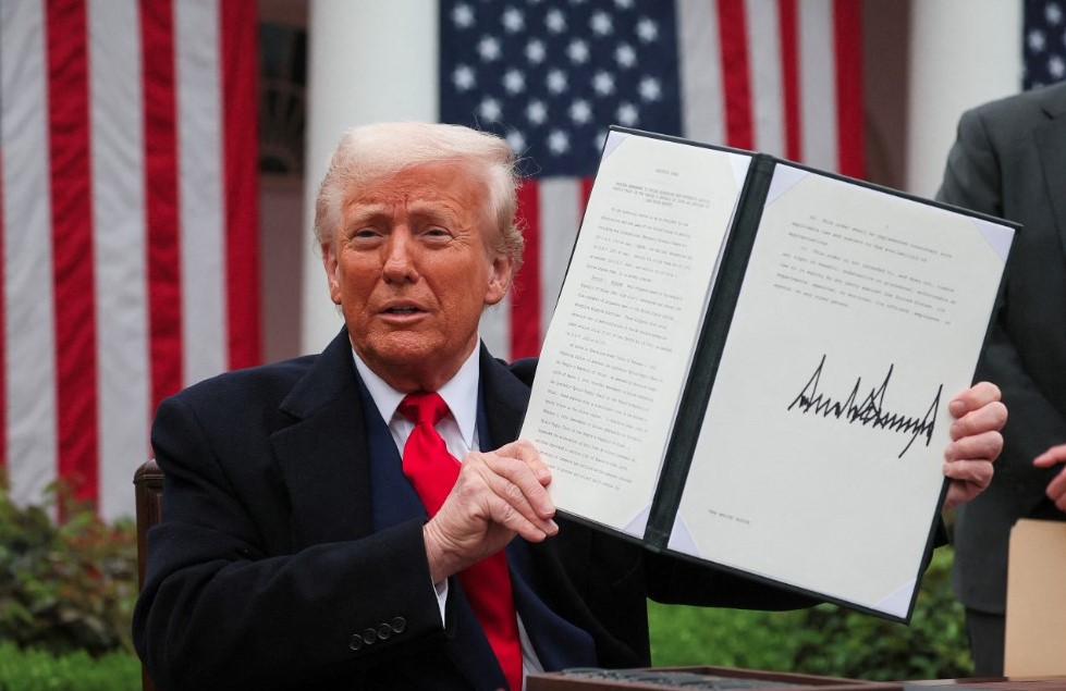 2025年4月2日、ホワイトハウスのローズガーデンで関税に関する大統領令を掲げるアメリカのドナルド・トランプ大統領(写真:Reuters) |