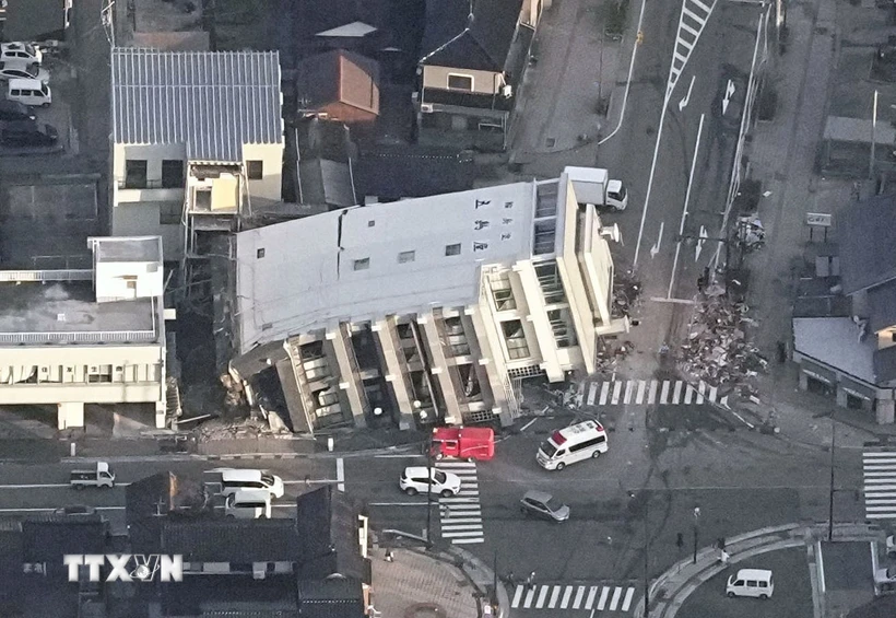 2024年1月2日、石川県輪島市で、地震で倒壊したとみられるビル(写真:Kyodo/TTXVN) |