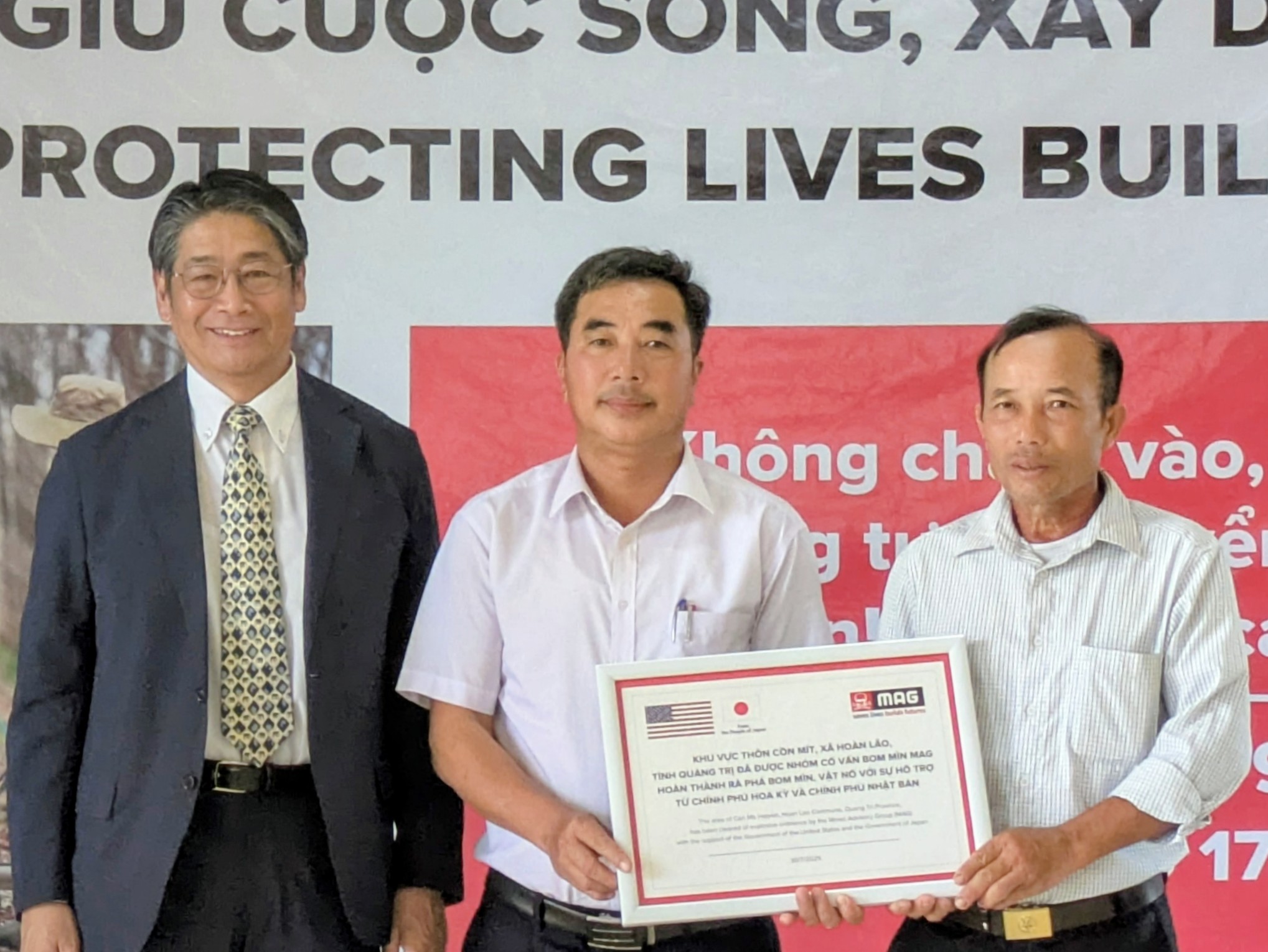 7月30日、中部クアンチ省ドンチャイック村において、日本政府による草の根・人間の安全保障無償資金協力「クアンビン省における統合的クラスター弾等除去計画」の一環として、除去作業を終えた約3平方キロメートルの土地の引渡し式が行われました。式典には、在ベトナム日本大使館の伊藤直樹大使と関係者、クアンチ省の指導者、人道的地雷除去を行う国際NGOマインズ・アドバイザリー・グループ(MAG)ベトナム事務所の関係者などが出席しました。