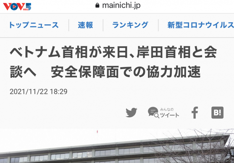 毎日新聞は「ベトナム首相が来日、岸田首相と会談へ 安全保障面での協力加速」をタイトルにした記事の中で、「外国首脳が来日し、首相と会談するのは10月の政権発足後初めて。『自由で開かれたインド太平洋(FOIP)』の実現に向け、安全保障、経済分野などでの協力の具体化を目指す。」と伝えました。また、「首脳外交も活発で、菅義偉前首相が昨年10月に就任後初の外遊先としてベトナムとインドネシアを訪問。岸田首相も今月、国連気候変動枠組み条約第26回締約国会議(COP26)首脳級会合出席のため英国を訪れた際、チン首相と会談した。」と明らかにしました。