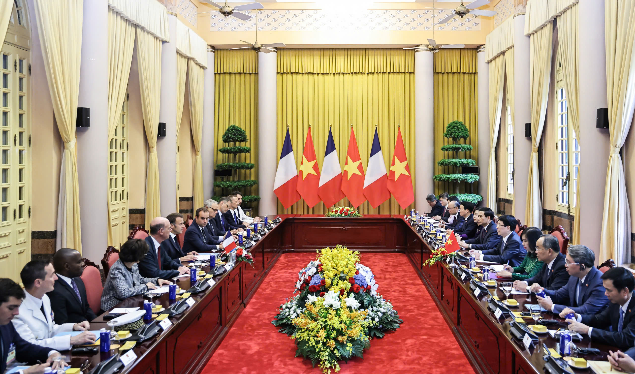 地域および国際的な懸案事項について、ルオン・クオン国家主席は、ベトナムが国際関係において「4つのノー」の国防政策を堅持していると強調しました。一方、マクロン大統領は、ベトナム東部海域(南シナ海)に関するASEANの立場への支持を表明しました。両首脳は、1982年の国連海洋法条約(UNCLOS 1982)を海洋におけるすべての活動と協力の包括的な法的枠組みと位置づけ、法に基づく平和的解決、海上・上空の自由航行、安全確保を再確認しました。COC=海上行動規範の早期制定に向けた努力への支持を示しました。