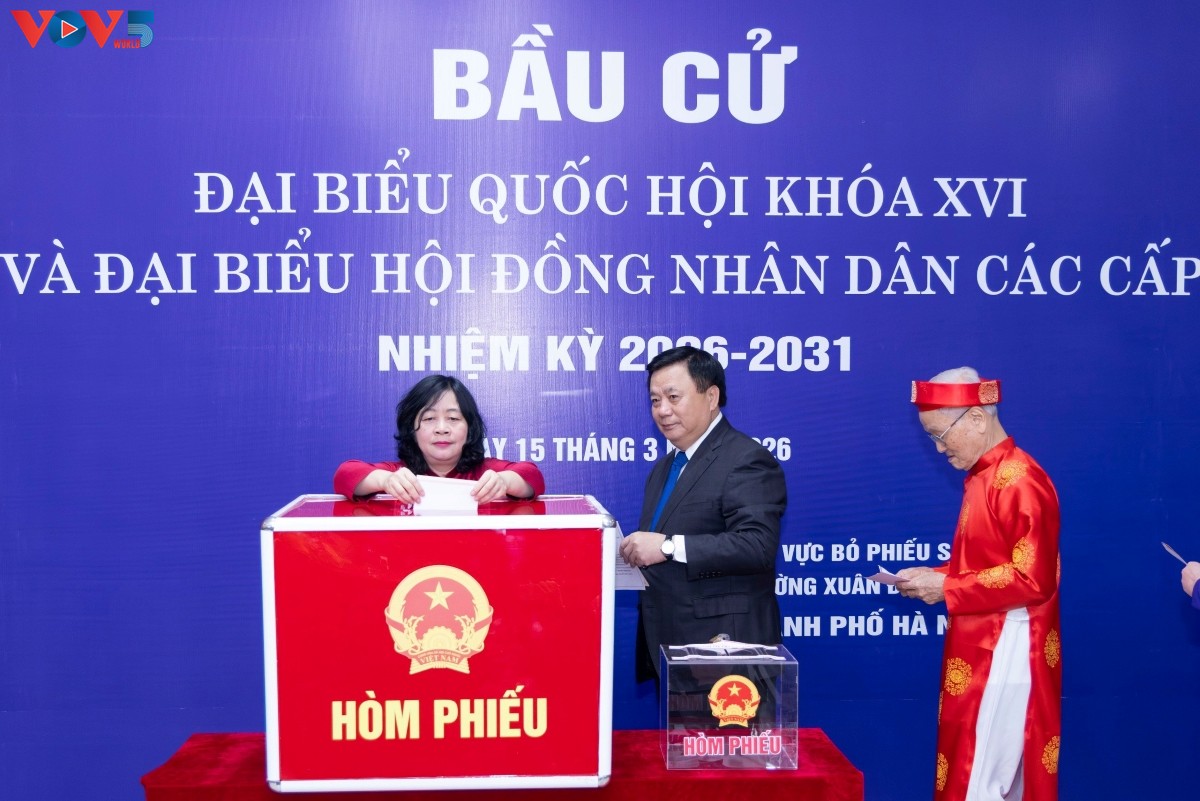 ハノイ市スアンディン地区の投票所では、ベトナム祖国戦線中央委員会の議長で国家選挙評議会副議長のブイ・ティ・ミン・ホアイ氏が最初の投票を行いました。続いて、ファム・ティ・タイン・チャー副首相も、地域住民と共に市民の権利と義務を行使しました。