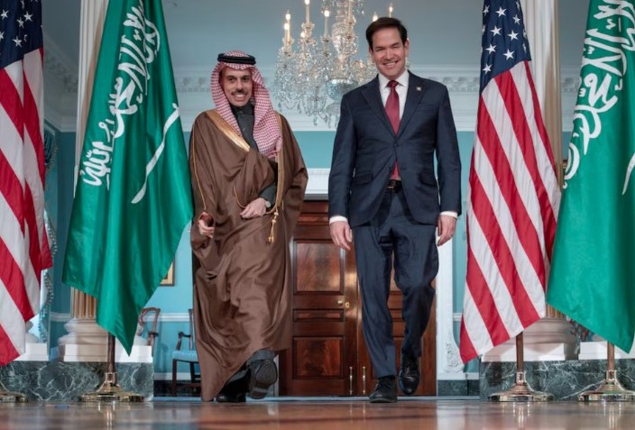 2025年4月9日、アメリカ・ワシントンD.C.の国務省で会談するマルコ・ルビオ国務長官(右)とサウジアラビアのファイサル・ビン・ファルハーン外務大臣(写真:REUTERS/Ken Cedeno) |