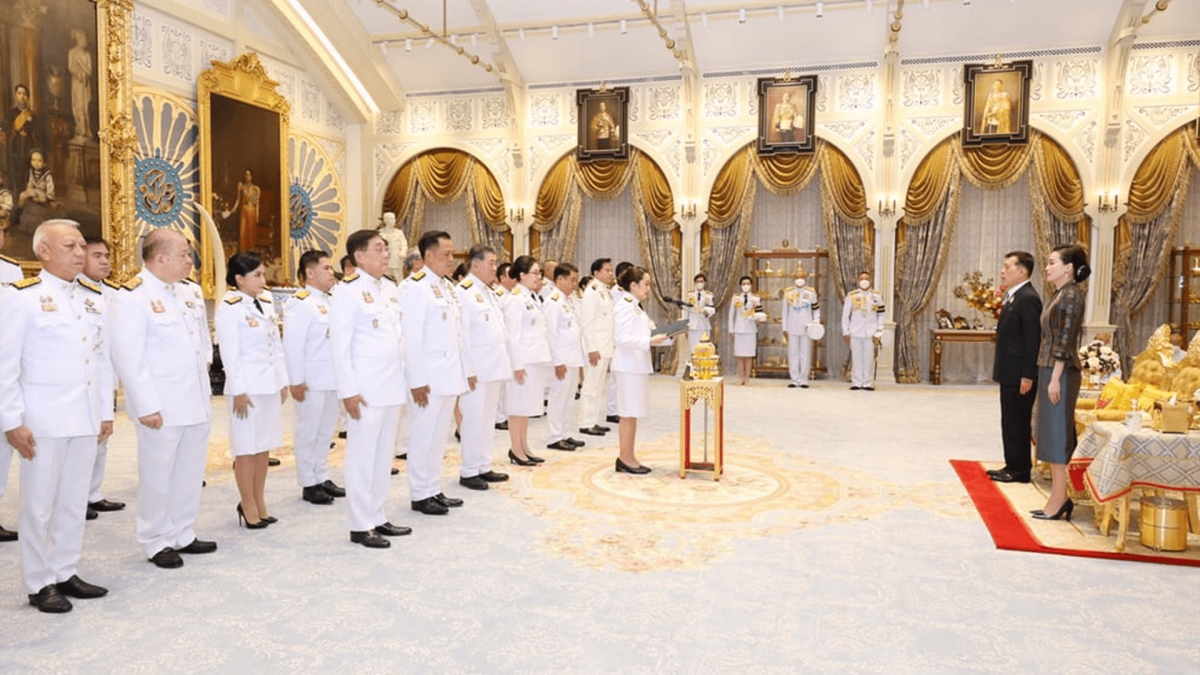 2024年9月6日夜、首都バンコクのドゥシット宮殿で、タイのタクシン元首相の次女で最大与党、タイ貢献党の党首のペートンタン首相ら閣僚が国王宣誓式に臨み、新政権が発足した(写真:Thai PBS) |