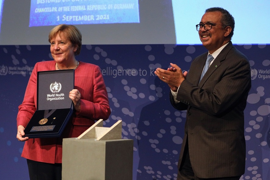 メルケル首相とテドロス事務局長(写真:EPA)