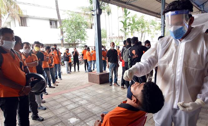 インドのアッサム州で、新型コロナ検査で、 鼻腔から検体を採取する医療従事者=THX/TTXVN |