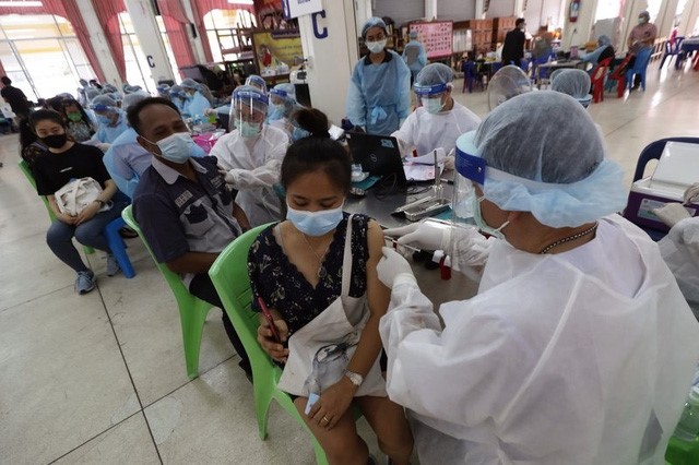 タイの首都バンコクの商業施設で、英アストラゼネカ製の新型コロナウイルスワクチン接種を受ける人=AP |